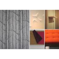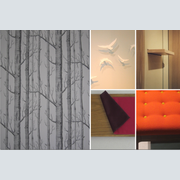 Waldmotiv mit Bäumen, fliegende Vögel, Stoffmuster und bunte Möbel.
