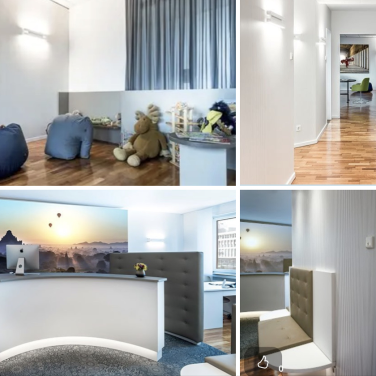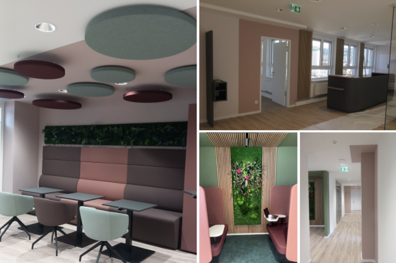 Moderne Büroräume mit Fenstern, Sitzbereichen und stilvollem Dekor.